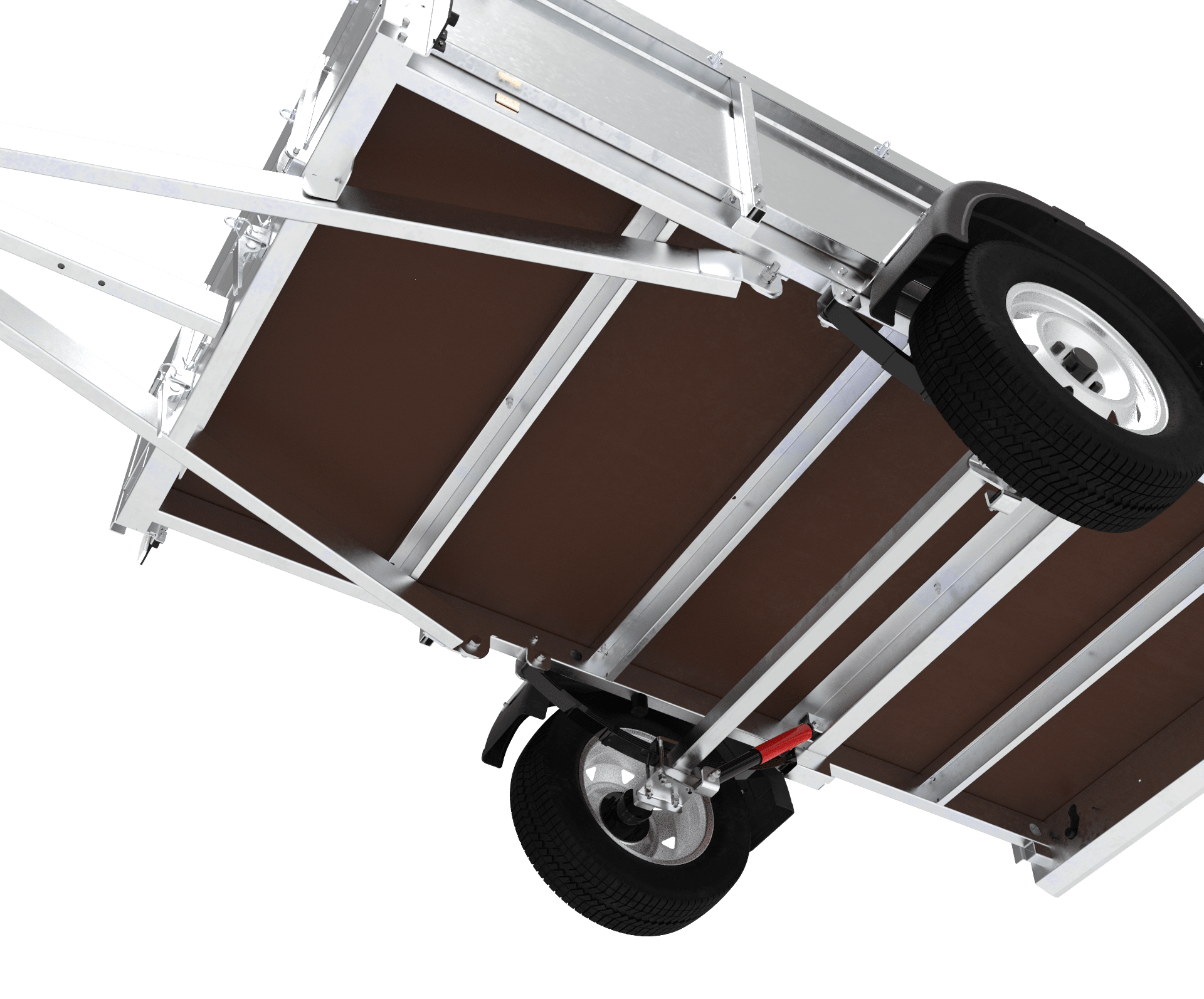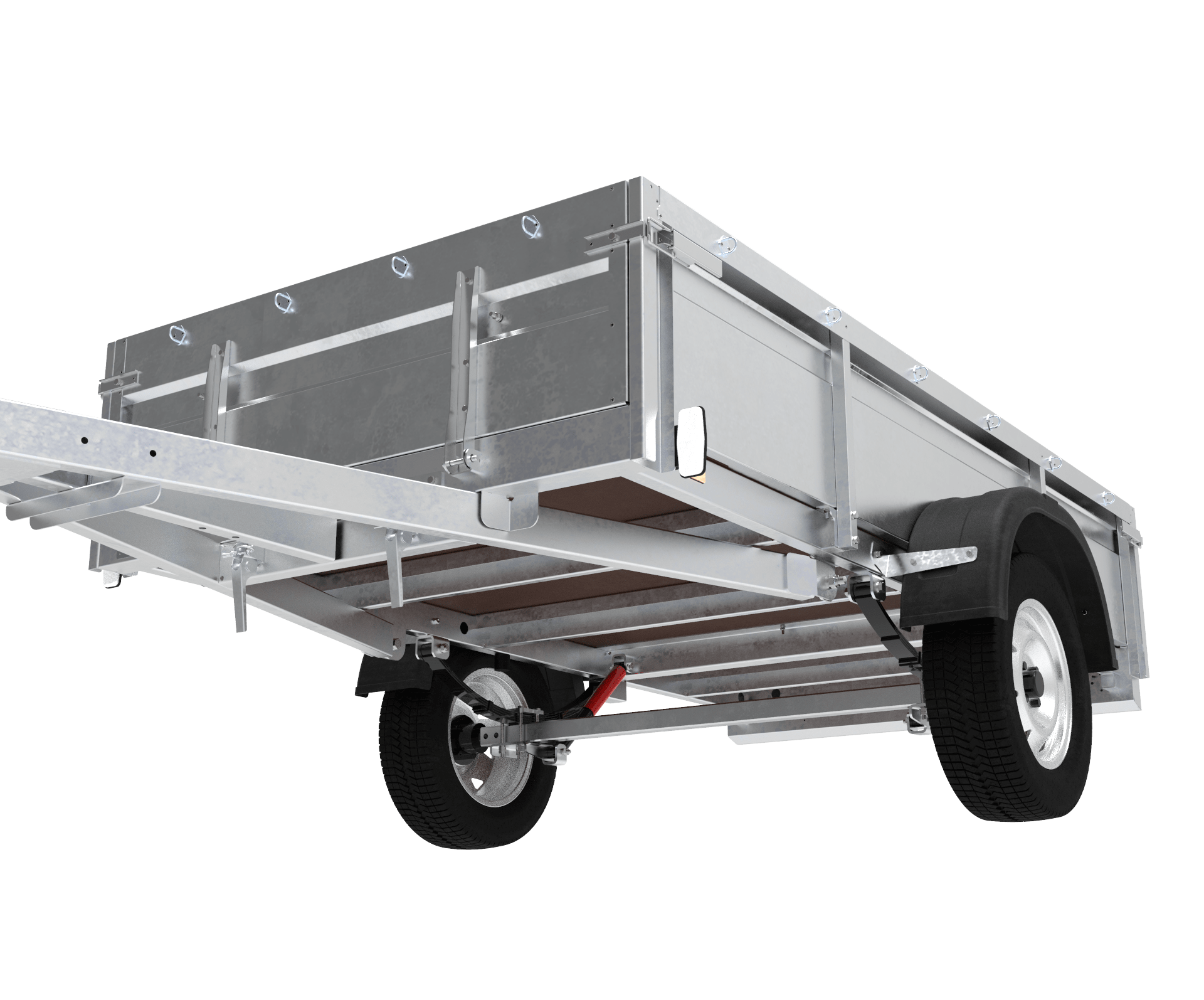 Борта гнутые с ребрами жесткости, монолитные по всей длине прицепа, высотой 400мм. Передний задний борт откидные быстросъемные с увеличенными по высоте петлями, усилены фанерой, которая утоплена внутрь борта и не «съедает» внутренний размер прицепа.